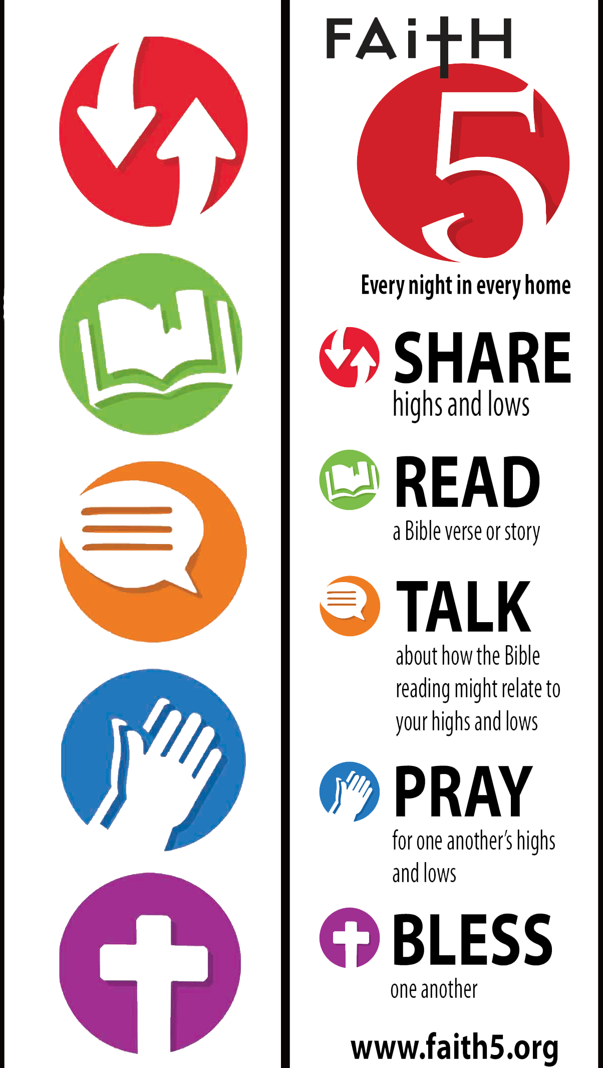 FAITH5 bookmarks are an excellent and affordable tool to share with the families to introduce this simple but effective "Every Night in Every Home" faith practice.