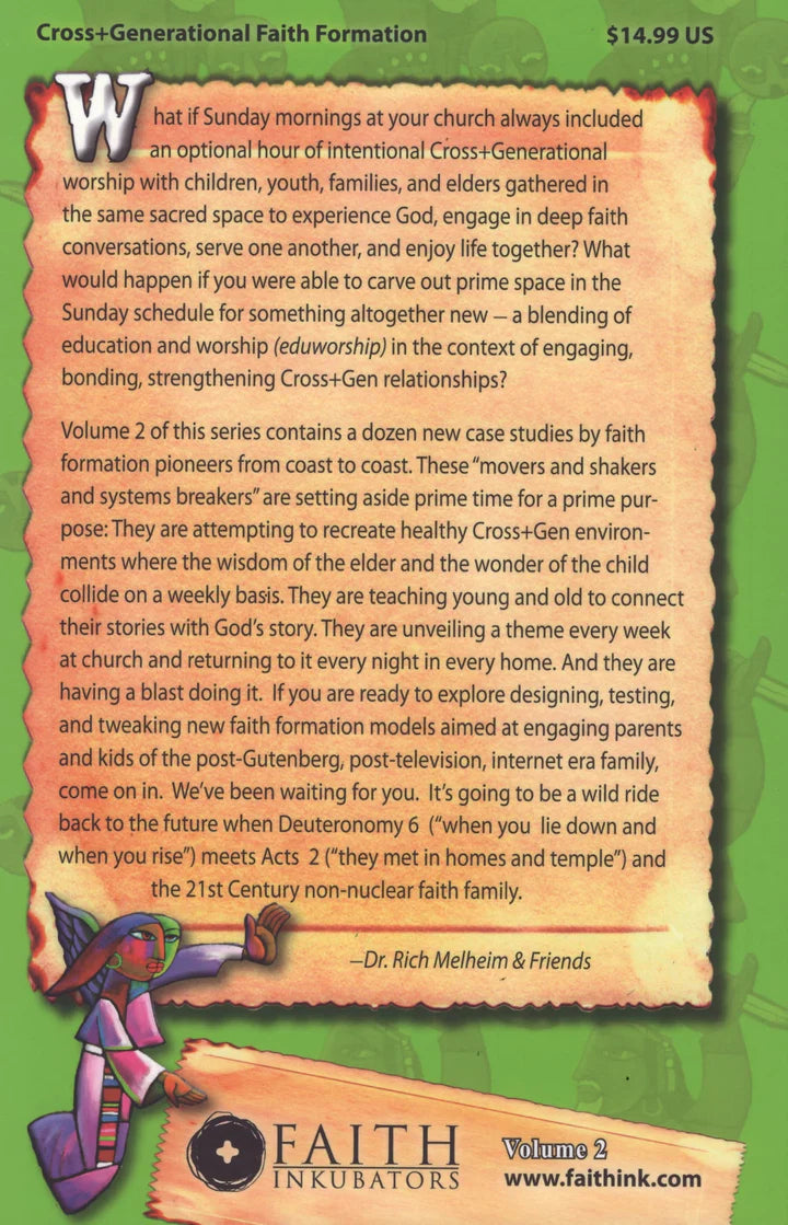 Volume 2 of this series contains a dozen new case studies by faith formation pioneers from coast to coast. These “movers and shakers and systems breakers” are setting aside prime time for a prime purpose: They are attempting to recreate healthy Cross+Gen environments where the wisdom of the elder and the wonder of the child collide on a weekly basis. They are teaching young and old to connect their stories with God’s story. They are unveiling a theme every week at church and returning to it every night in every home. And they are having a blast doing it.