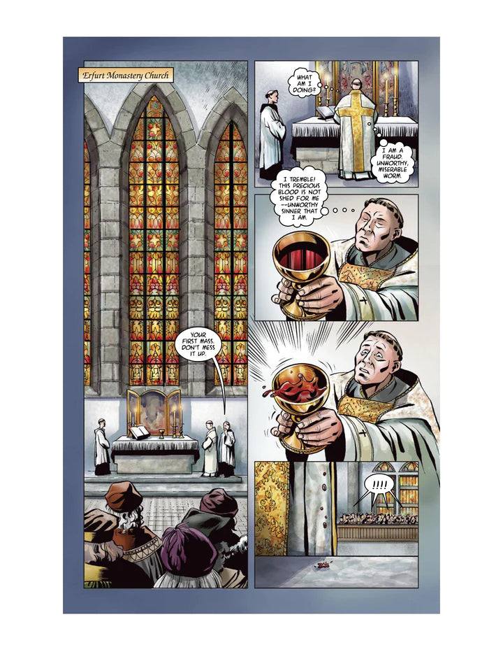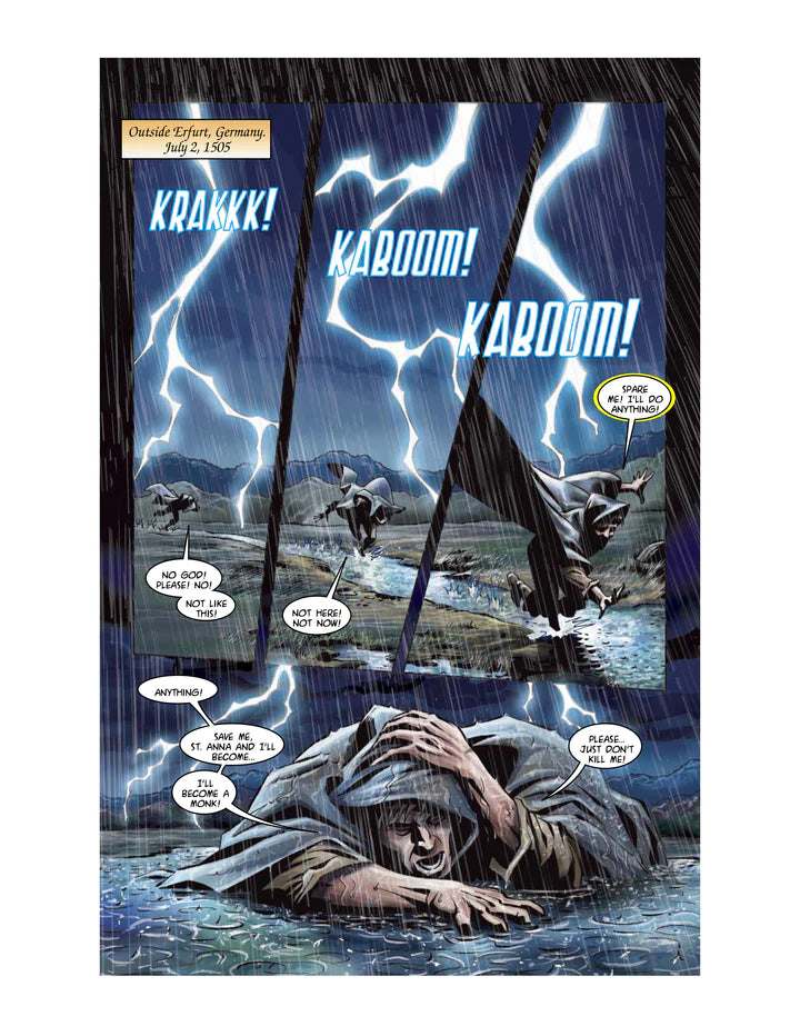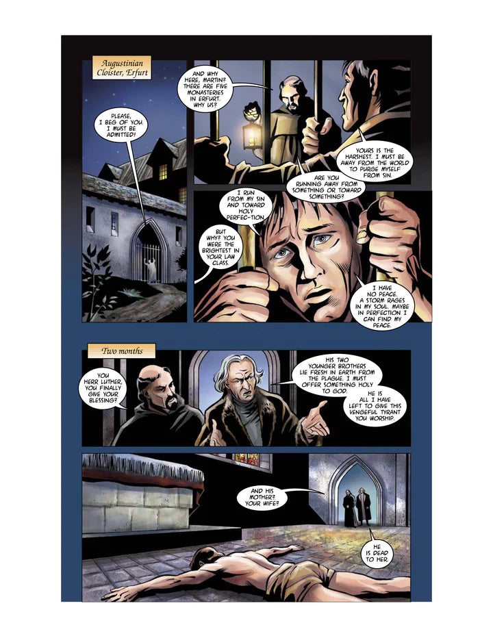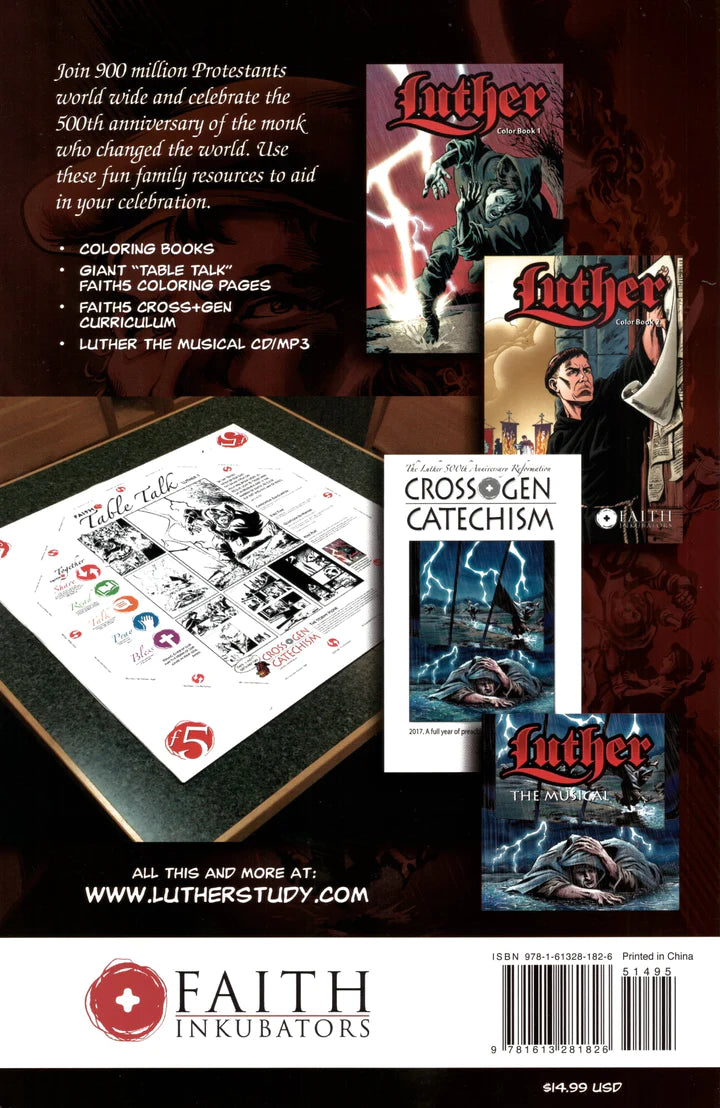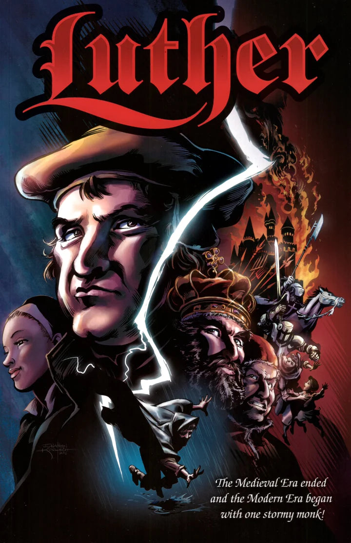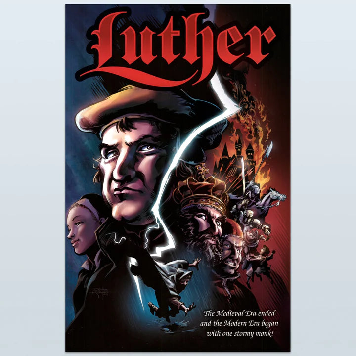 Illustrated by the award-winning talents of Tim Kane, Sherwin Schwartzrock and Jonathan Koelsch, Luther: The Graphic Novel leaps from the pages. Beginning with the hauntingly predictive martyrdom of Reformer Jan Hus, the story moves to the electrical storm that launched a young law student to the monastery. It moves from his restless quest to find peace with God, to the protesting professor nailing his objections to the Wittenberg Door 500 years ago next year. It takes you from the heretic’s trail, to Luther’s staged kidnapping, and up to and through the unlikely events that gave the protesting monk and his death-defying princes the breathing space for the reform to take hold…. And eventually split the church.