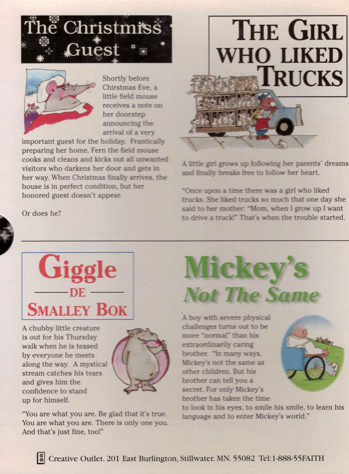 The watercolor cartoons are bright and whimsicle. The story lines are involving and disarming. And each theme is a powerful conversation starter as it veils a lesson for child and parent to discover together. All stories come with a "Questions to Ponder" section to facilitate parent/child discussion. Each is appropriate for home, classroom or library.